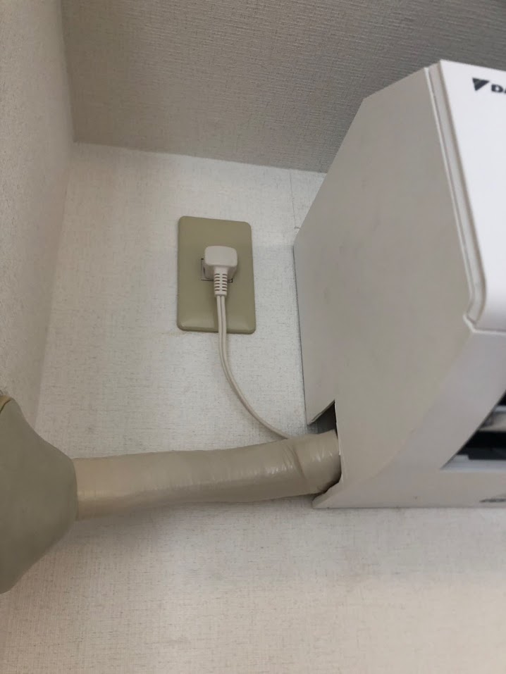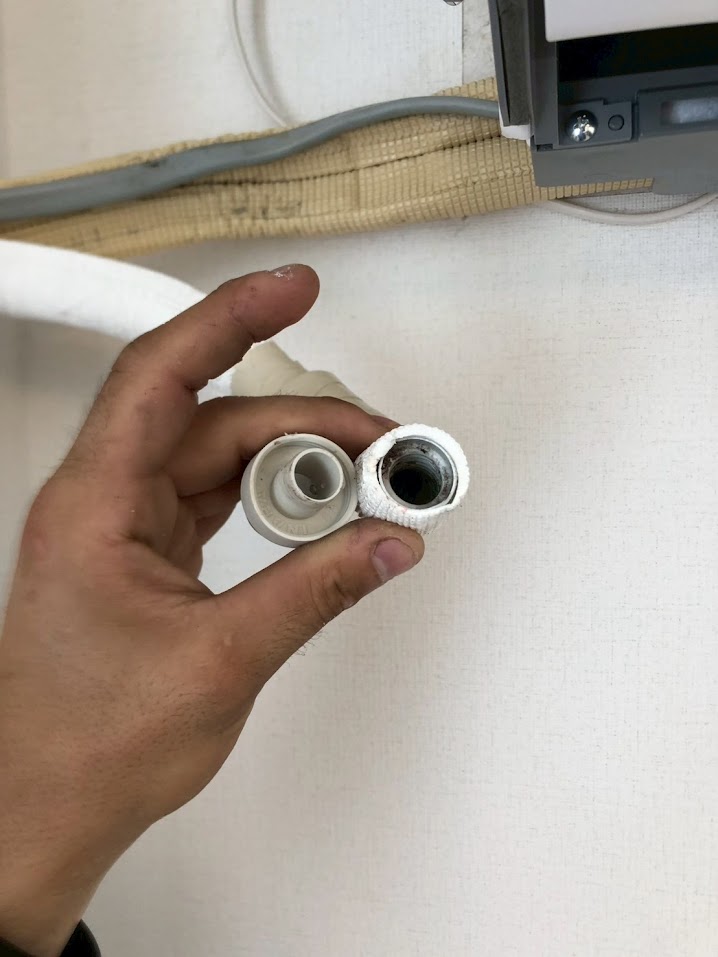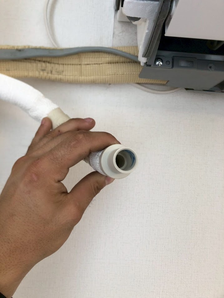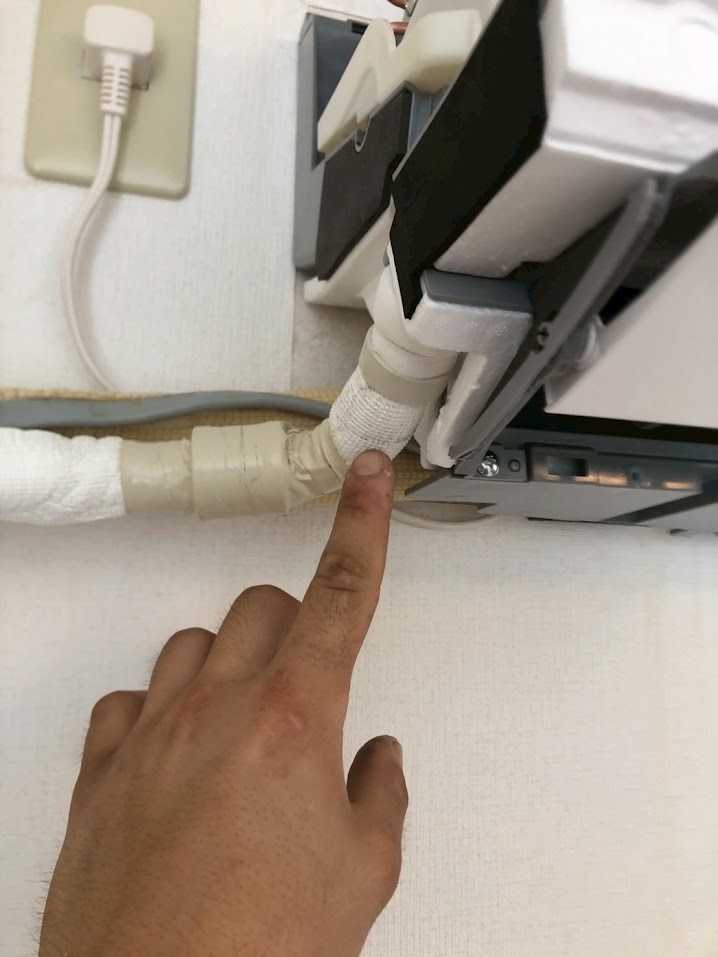 ドレンホースと呼ばれる、エアコンの室内機で発生する結露水を室外へ排出するための排水ホースに差し込み不備が生じておりました…!